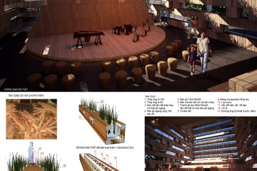 - Công trình được tạo nên từ các hệ dàn thép (theo nhiều mô đun, dài nhất = 7,5m) liên kết với nhau theo hình thức nối & chồng/ gác đơn giản. Bề mặt dàn thép được bao phủ bằng các bản gỗ tạp (tận dụng -> giúp giảm thiểu chi phí). Dàn thép có nhiều công dụng: Chịu lực; trồng lúa (đặt trong máng); tạo hốc trưng bày hiện vât/ đồ dùng; trục kỹ thuật cấp/ thoát nước & điện …